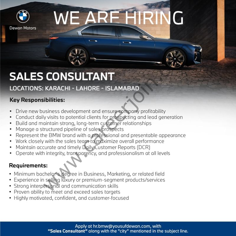 Dewan Motors is hiring a ‘Sales Executive’ to be based in multiple cities across Pakistan. If you are confident and passionate about luxury automotive sales, we want to hear from you!