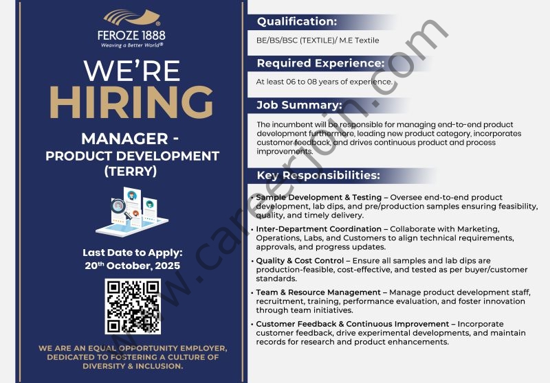 Feroze1888 Mills Ltd. is looking for a dynamic and detail-oriented professional to join our team as Manager – Product Development (Terry). This is your opportunity to become part of a purpose-driven organization dedicated to Weaving a Better World.