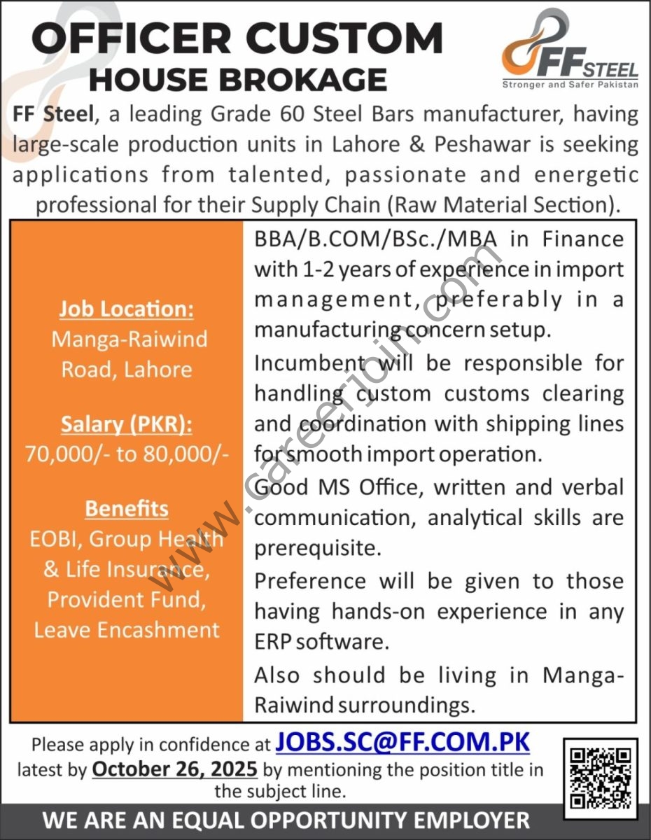 FF Steel, a leading Grade 60 Steel Bars manufacturer, having large-scale production units in Lahore & Peshawar is seeking applications from talented, passionate and energetic professional for their Supply Chain (Raw Material Section).