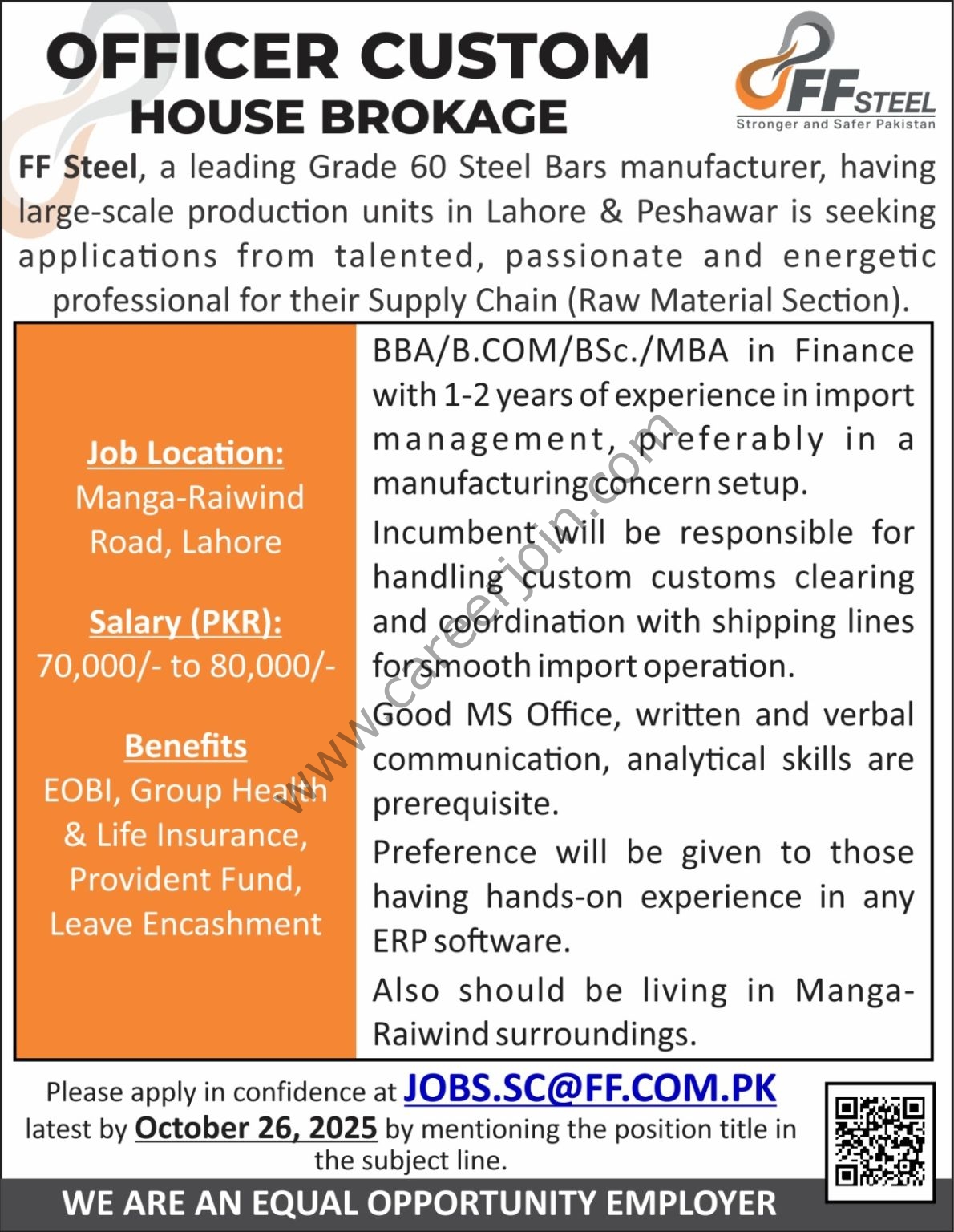 FF Steel, a leading Grade 60 Steel Bars manufacturer, having large-scale production units in Lahore & Peshawar is seeking applications from talented, passionate and energetic professional for their Supply Chain (Raw Material Section).