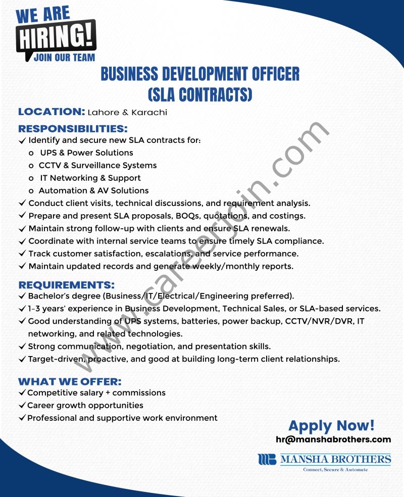 Mansha Brothers is seeking a proactive Business Development Officer (SLA Contracts) to join our team in Lahore & Karachi.