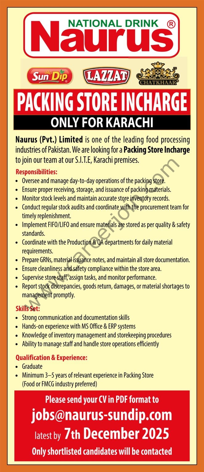 Naurus (Pvt) Limited Jobs Packing Store Incharge :
