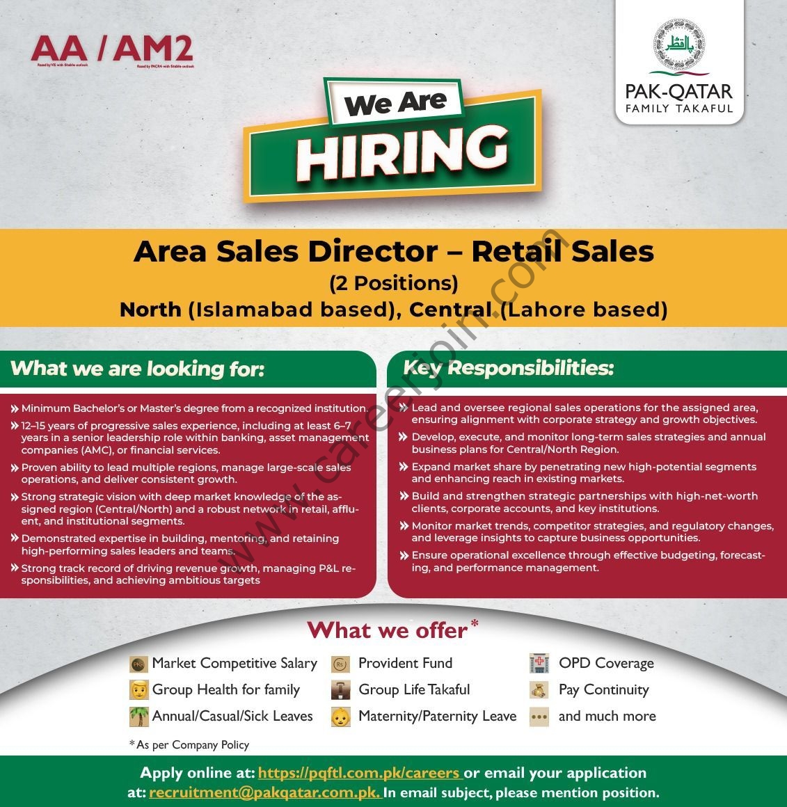Pak-Qatar Family Takaful is looking for dynamic, visionary leaders to join us as Area Sales Directors – Retail Sales for our North (Islamabad) and Central (Lahore) regions.