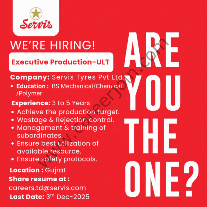 Servis Tyres Pvt Ltd is looking to hire Executive Production (ULT Tyres).
